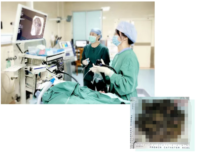在胃镜帮助下,妮妮胃里的情况逐渐明了。一个滚圆黑色的毛发球混合着食物残渣占据整个胃腔,这些头发相互缠绕形成一个实心的“发石”,此外胃里还有一个鸡蛋大小的溃疡。