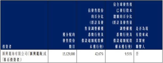 配发结果公告显示,海伟股份的基石投资者为汇兴丽海有限公司,获分配的发售股份数目为15,129,000股股份,占发售股份的百分比(经计及发售量调整权获悉数行使及假设超额配股权未获行使)42.67%,占全球发售后已发行股本总额的百分比(经计及发售量调整权获悉数行使及假设超额配股权未获行使)9.51%。