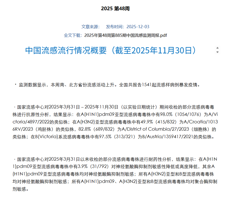 国家流感中心12月3日发布的周报数据显示,2025年第48周(截至11月30日)全国共报告1541起流感样病例暴发疫情,较第47周的1234起有所增加,且南、北方省份报告起数高于去年同期——2024年第48期全国仅报告31起。